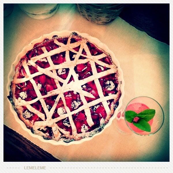 Ciasto kruche z babcinego "przepiśnika" gotowe w 3 minuty, truskawki i kilka łodyg rabarbaru,do ktorego dodaje cukru i odrobine bulki tartej,zeby nie bylo za bardzo rozwodnione jak pusci sok.