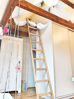 Zwykła drabina ze sklepu budowlanego została na stałe przykręcona do podłogi i jednego z legarów. "Baza" spełnia swoją role, bo powstał tam mały kącik gdzie oglądają bajki i robią tajemnicze spotkania :-)